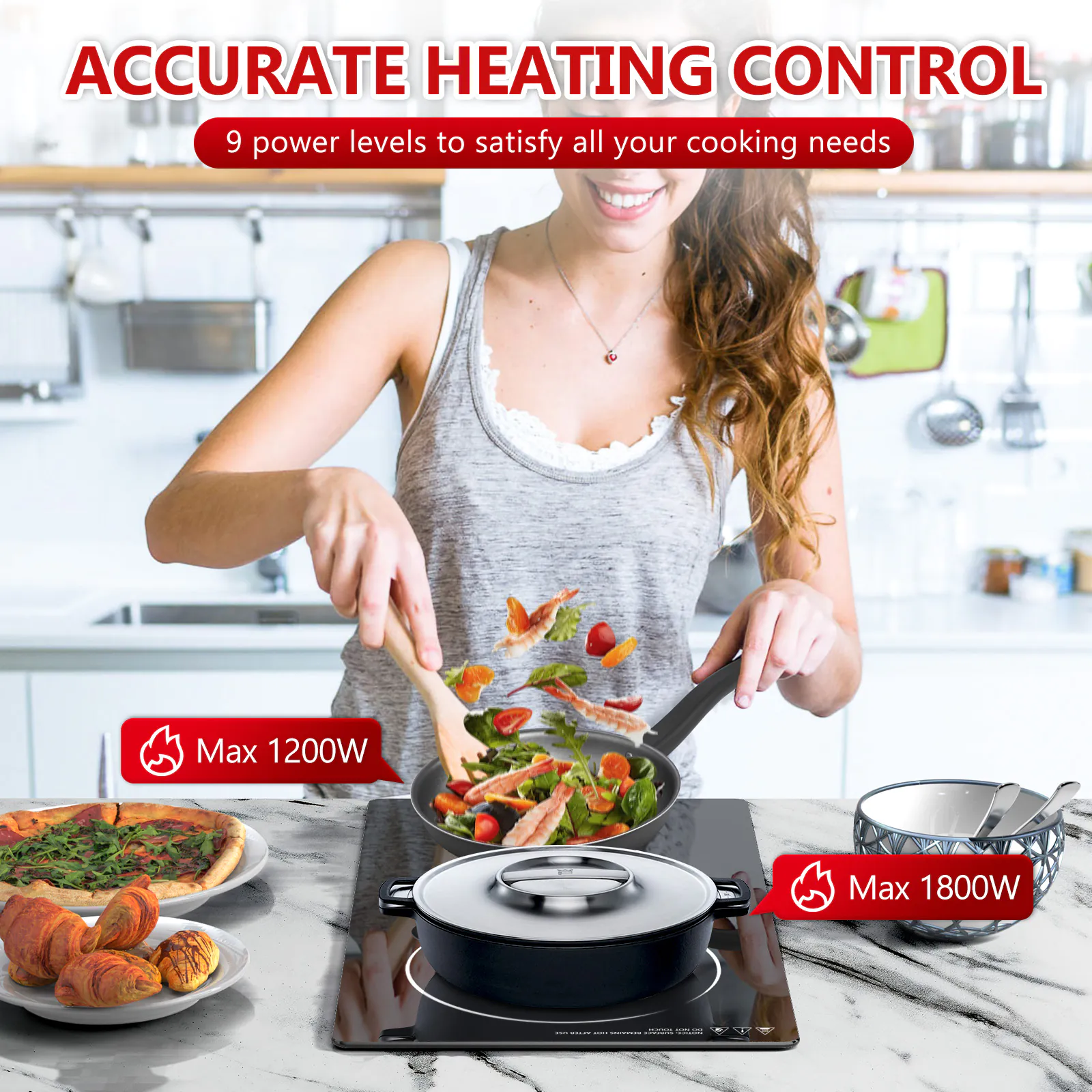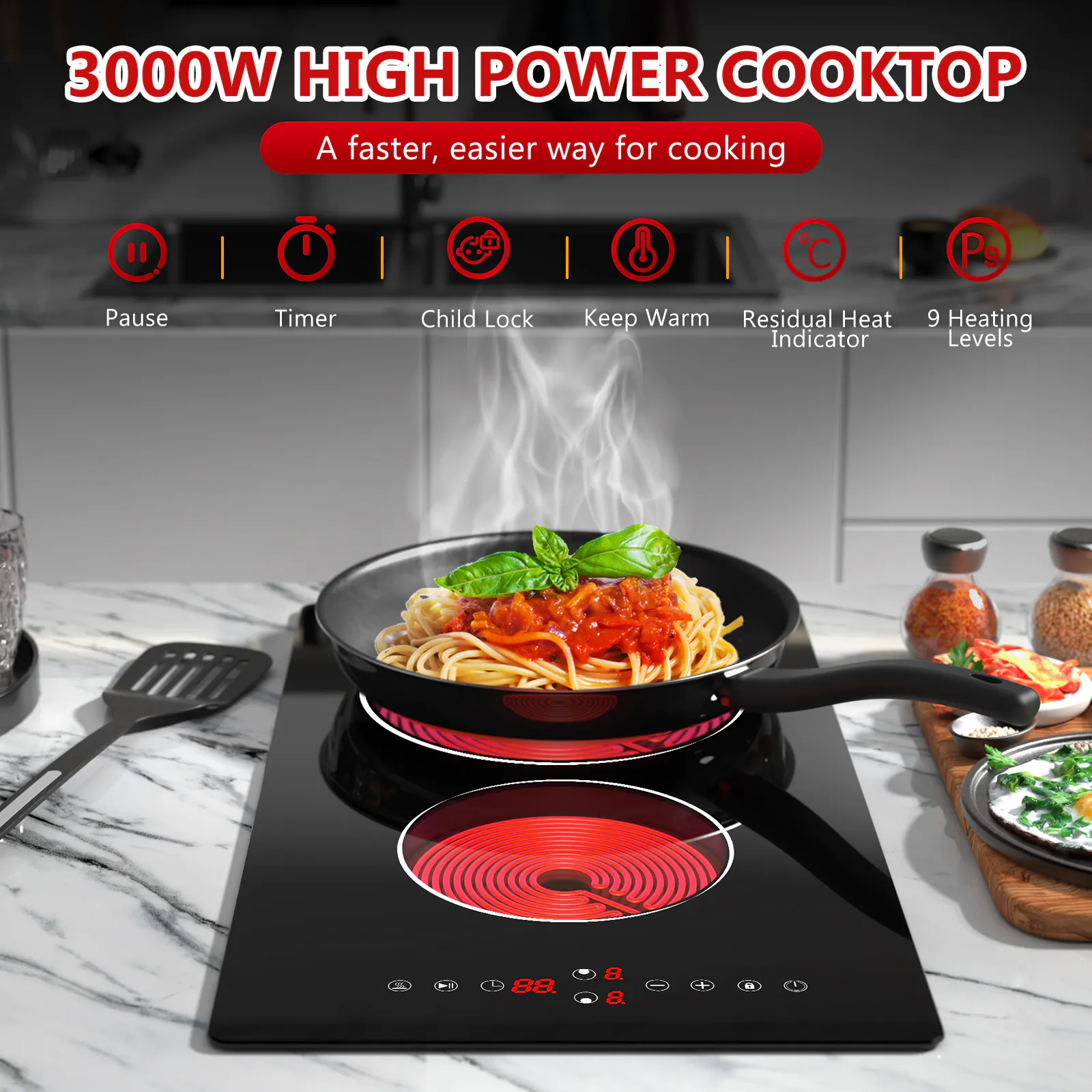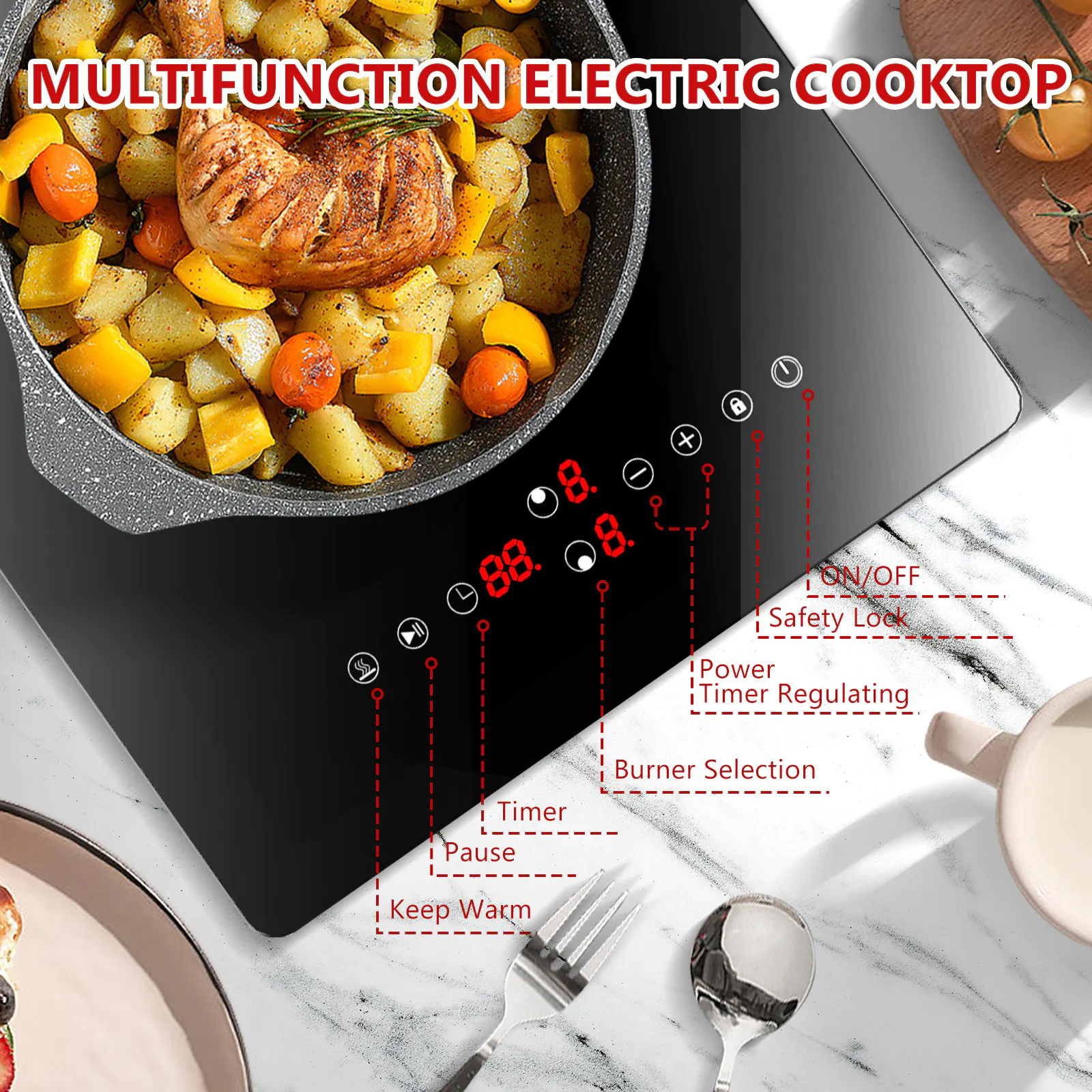 ✔【Advanced Safety Features】 2 burners of electric stovetop equipped with various functions: keep warm, pause, child safety lock, 99-minute timer, residual heat indicator, auto shutoff, and overheating protection, this two burner electric cooktop ensures safe and worry-free operation for all family members.