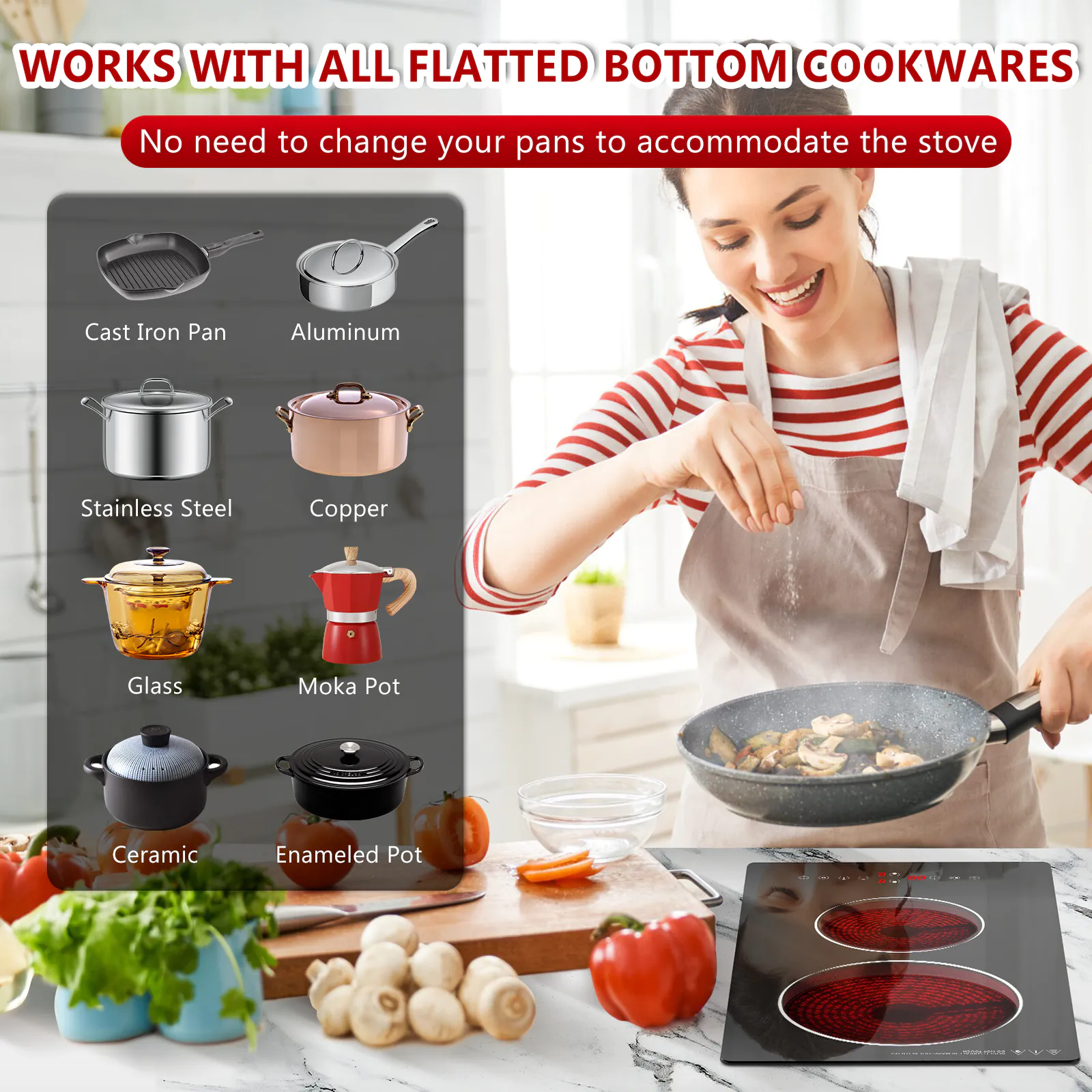 ✔【Cookware-Friendly Ceramic Cooktop】Unlike inductions, This built-in electric stoves for kitchen is a electric ceramic cooktop,which is convenient that compatible with any cookware such as stainless steel, cast iron, glass, and ceramic pots, glass cookware and so on. Moreover, the 2 burner electric cooktop has no electromagnetic radiation and is harmless to the human body.