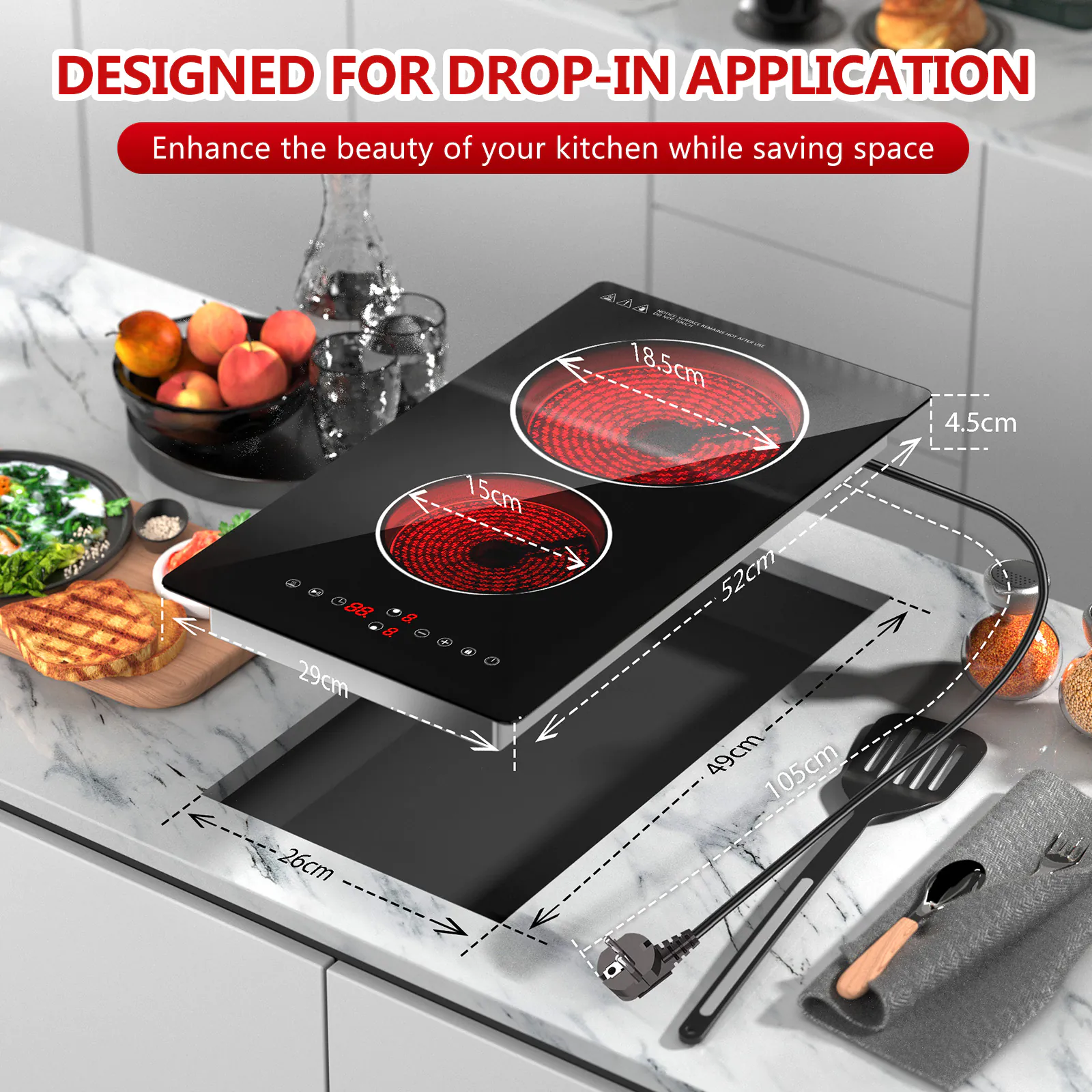 ✔【Versatile Countertop Stove Top Electric】 This two burners electric stove can be used as a portable countertop 2 burner stove or seamlessly install it into your kitchen for a sleek, space-saving look. 4 bottom non-slip standers included to ensure stability, making it ideal for both home kitchens, outdoor cooking setups or holiday spare electric cooktop
