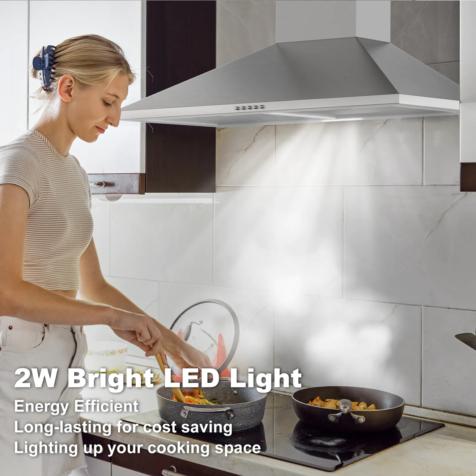 Bright, energy-efficient LED lights illuminate your stove. The 5-layer aluminum oil fume filter is dishwasher-safe for easy maintenance.