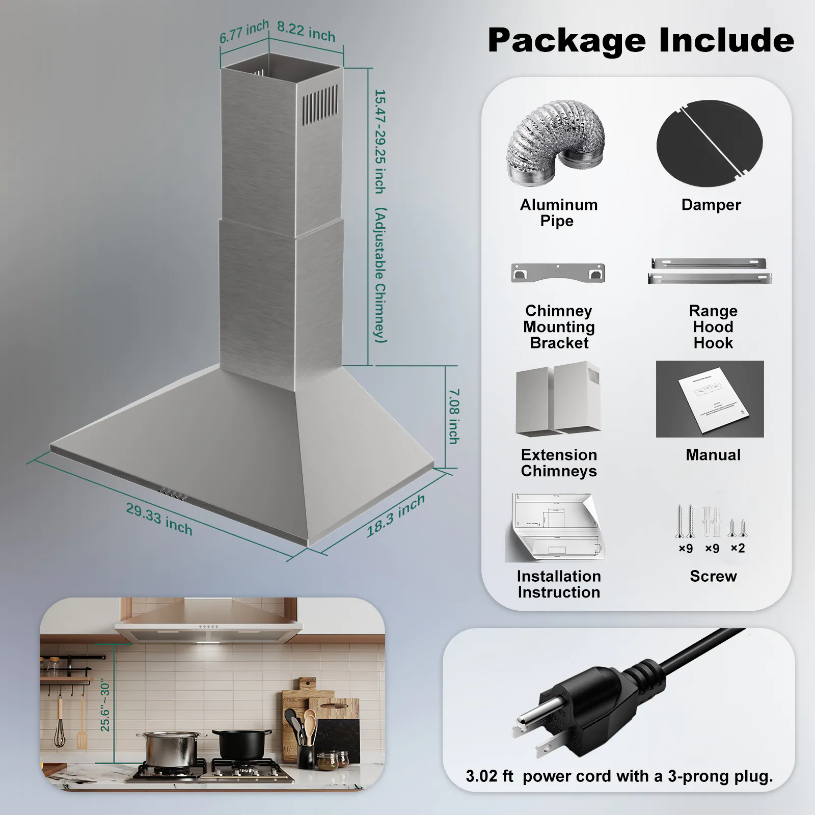 30 inch Wall Mounted Range Hood – Brushed Silver